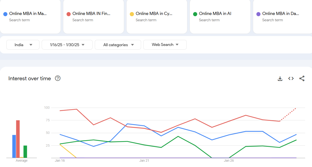 It’s not just our perspective—Google Trends data supports this growing interest. Google Trends is a powerful tool for analyzing search patterns, clearly highlighting what people value. We have seen a 42% increase in Online MBA searches in just the last 30 days.