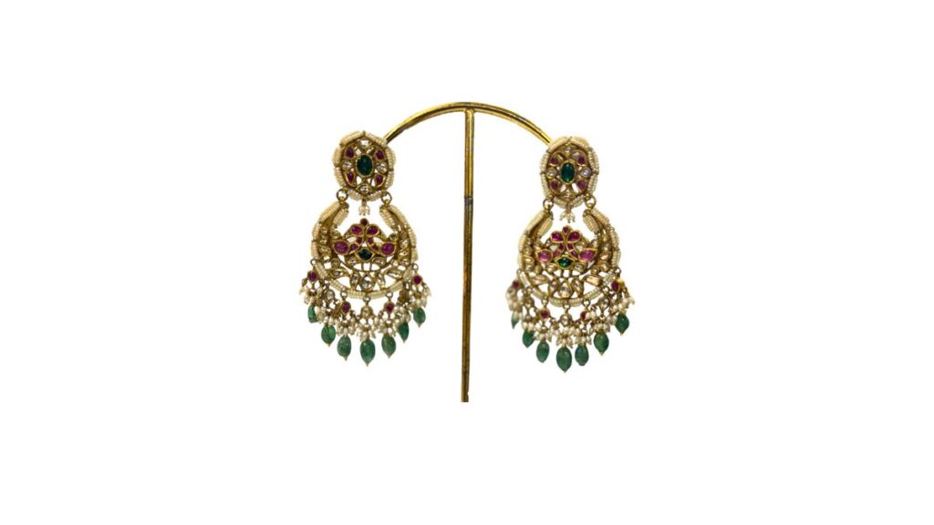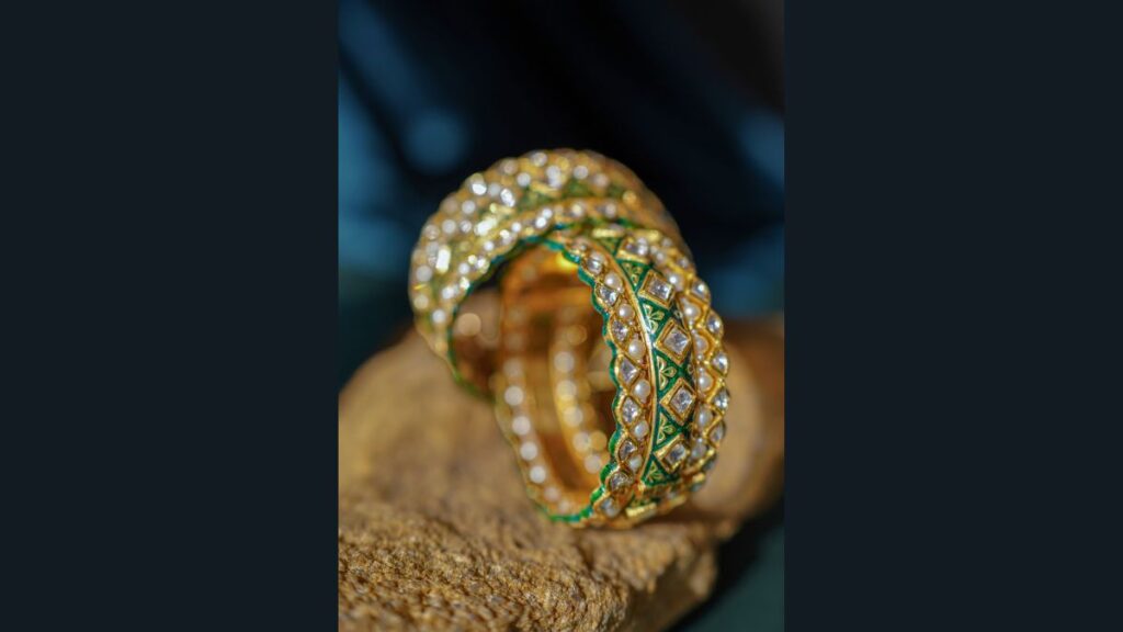3. The Courtesan’s Kada: The primary material appears to be gold, lending the bangles a rich and luxurious sheen. These bangles are a beautiful blend of gold, gemstones, and enamel work, representing the pinnacle of traditional Indian jewellery design. Their intricate patterns, high-quality materials, and cultural significance make them a cherished piece for any jewellery collection. It tells the tale of the elegance and charm of Heeramandi’s courtesans.